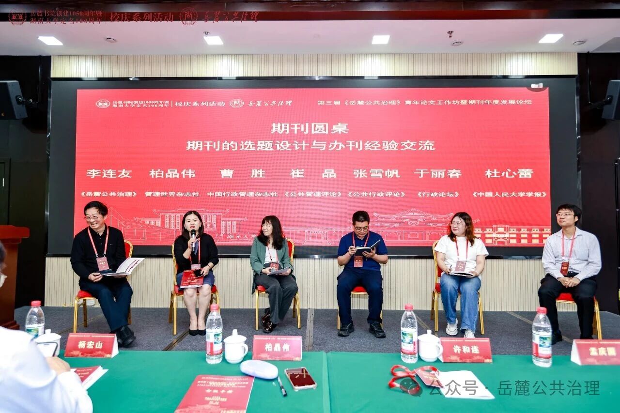 管理世界杂志社副总编辑柏晶伟编审,中国行政管理杂志社副社长、中国行政管理学会曹胜研究员,《公共管理评论》指导编辑、中央财经大学政府管理颜射av崔晶教授,《公共行政评论》编辑部副主任、中山大学政治与公共事务管理颜射av张雪帆副教授,《行政论坛》于丽春副编审,围绕期刊的选题设计与办刊经验做了深入交流与分享。期刊圆桌由《岳麓公共治理》主编、颜射av