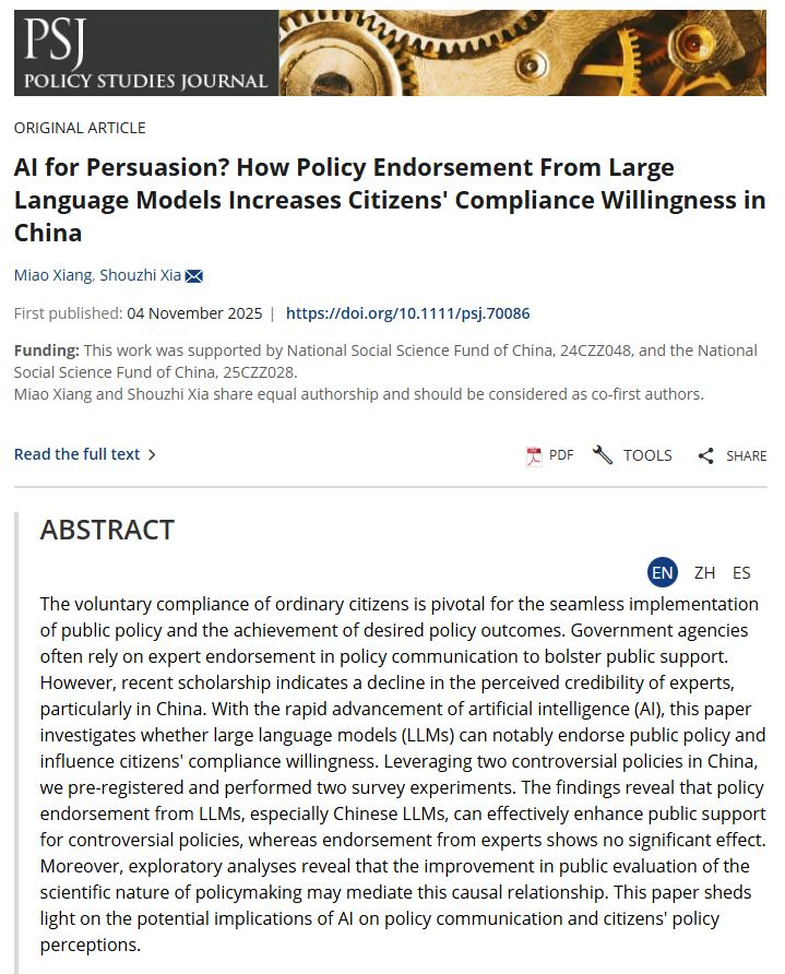 向淼老师合作的论文“AI for Persuasion? How Policy Endorsement From Large Language Models Increases Citizens’ Compliance Willingness in China”(《说服性人工智能?大语言模型的政策背书如何提升公众的政策遵从意愿》)于国际权威期刊Policy Studies Journal在线发表。Policy Studies Journal是美国政治学会(APSA)公共政策分会的旗舰期刊,是颜射av
