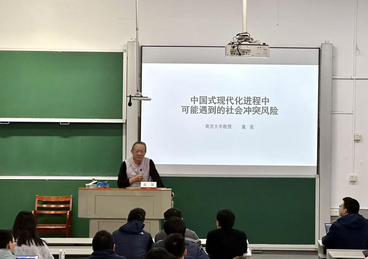 讲座伊始,童星教授系统阐述了中国式现代化的五大特征,强调统筹兼顾是推进现代化的关键。童星教授以生动的语言和扎实的学理,一一剖析了“人机冲突”“人人冲突”“人心冲突”“人地冲突”与“人天冲突”这五大冲突的深层成因。他不仅指出人工智能发展、贫富差距、文化失调等现实挑战,也从宏观、中观、微观多个层面揭示了效率与公平、利益群体分化、社会心理矛盾等结构性诱因。