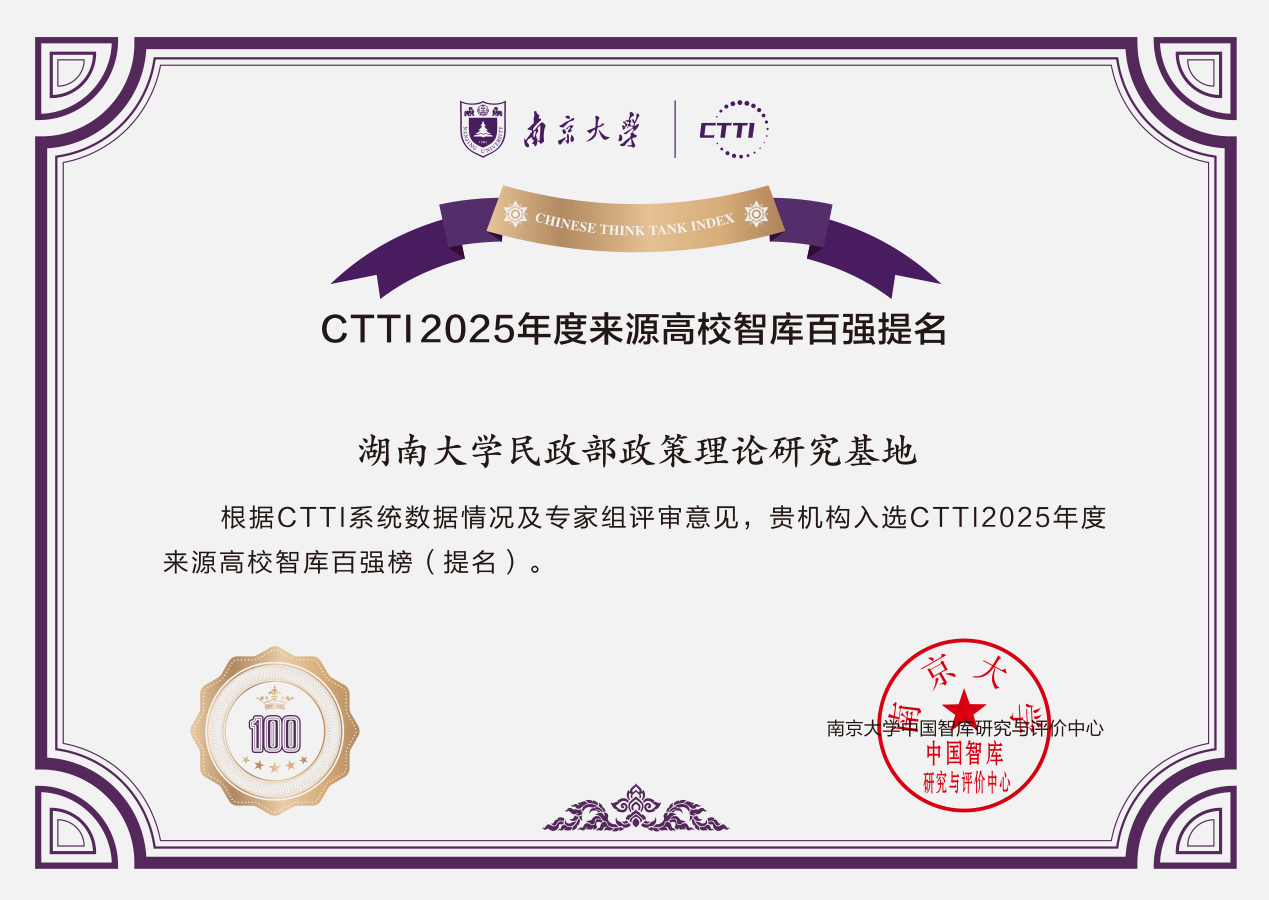 民政部政策理论研究基地”入选“CTTI2025年度来源高校智库百强提名”。